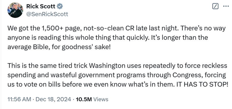 Earlier this week, Senator Scott led a press conference with Congressman Andy Harris, Chair of the House Freedom Caucus, and their Senate and House Republican colleagues supporting a two-step reconciliation strategy in the 119th Congress. The members have been clear on the need to immediately pass a reconciliation bill focused on transformational America First legislation to secure the border, followed by the passage of a second reconciliation bill to prevent Democrat tax hikes, extend the Trump Tax Cuts, and slash wasteful government spending through reforms and cuts identified by the new Department of Government Efficiency. Joining Senator Scott and Congressman Harris were Senators Mike Lee, Ron Johnson, and Representatives Andy Biggs, Ralph Norman, Clay Higgins and Scott Perry.