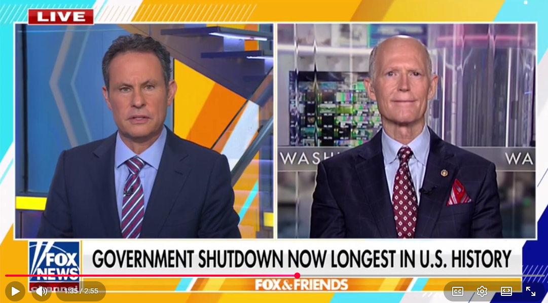WASHINGTON, D.C. – In case you missed it, Senator Rick Scott joined Fox & Friends as Democrats continue to hold Americans hostage by refusing to open up government. During the interview, Senator Scott blasted Democrats for dragging out the Schumer Shutdown, now the longest in recorded history, out of their pure hatred for President Trump and total disregard toward the 42 million Americans who rely on SNAP benefits, as well as the military, TSA, FAA, and every other federal worker who has continued to miss paycheck after paycheck. Senator Scott also called out the Democrats’ blatant hypocrisy for blocking his No Budget, No Pay Act, which would finally hold Congress accountable by cutting off members’ pay if they fail to fund the government.